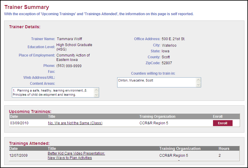The result: The trainers that match the criteria entered and/or selected display in the Details section of the page.