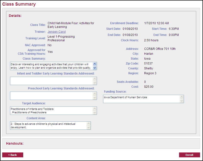 The results: The training Summary page for the selected Class, Conference, or Series displays.